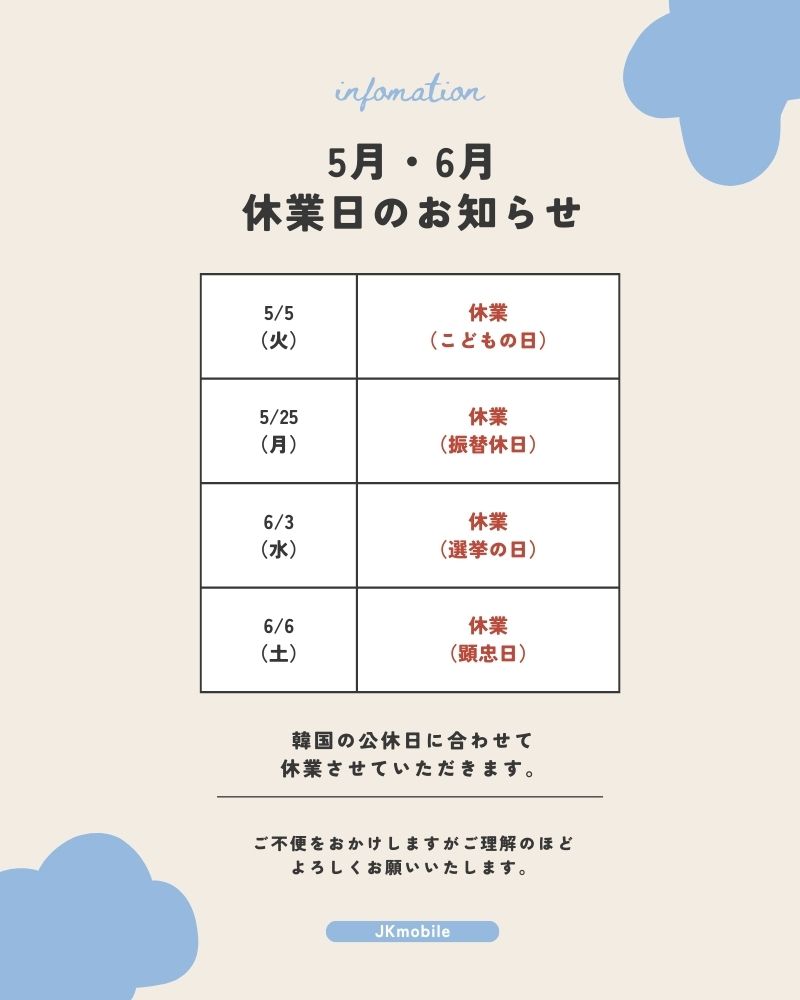 連休中は基本的にカカオトークやLINEでのお問い合わせもご対応が難しくなっております。そのため、大事なご相談は連休前にあらかじめお問い合わせいただきますようお願いいたします。